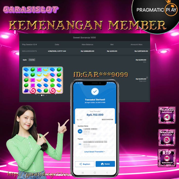Selamat atas kemenangan user ID: gar***9099 yang telah berhasil mendapatkan jackpot di permainan PRAGMATIC dengan kemenangan besar RP 5.702.000,-. Setelah berhasil isi form withdraw team GARASISLOT langsung proses hanya 2-3 menit untuk transfer kemenangan team kita selalu yang terbaik.