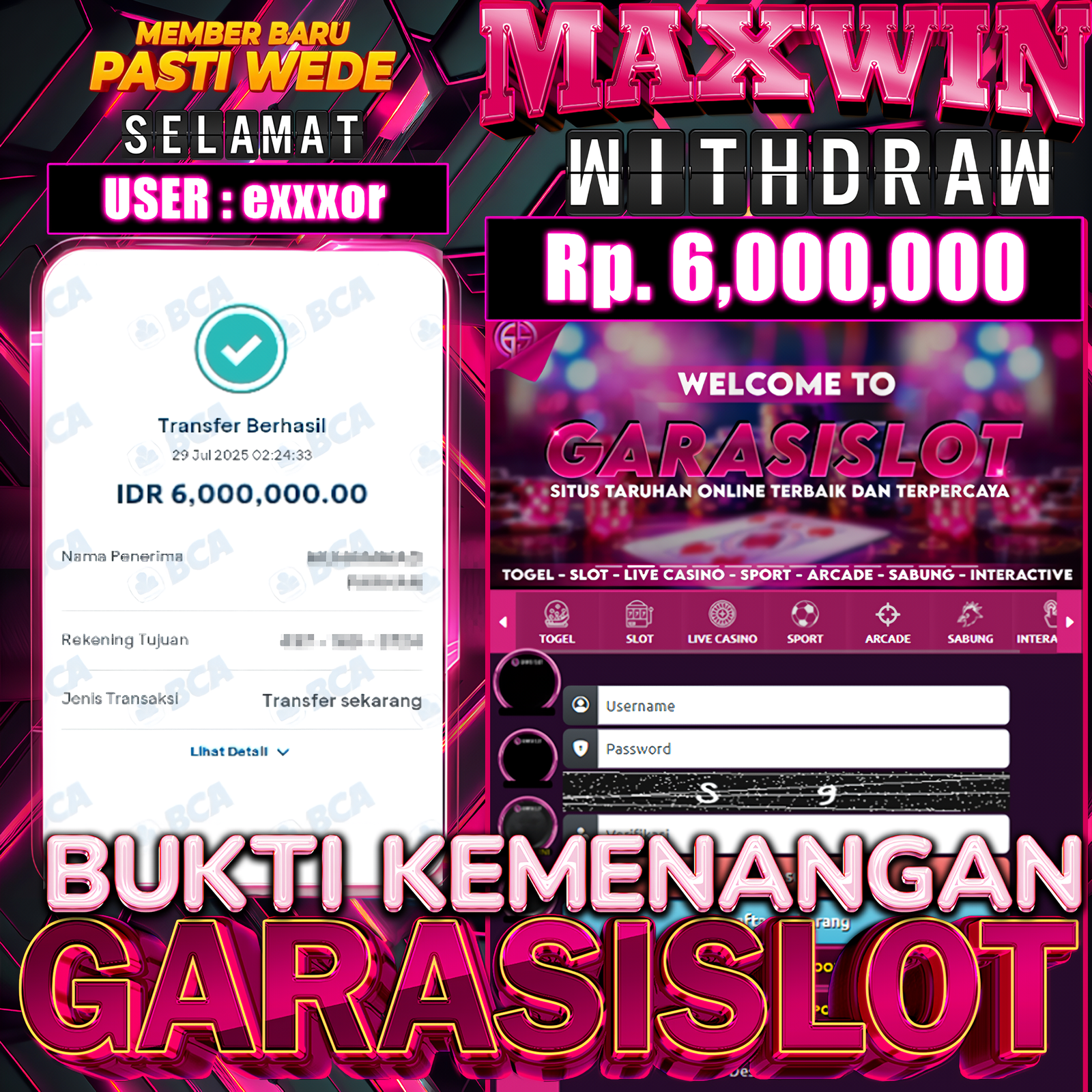 Selamat Kepada Id : Ka***987 Atas Withdraw Rp. 6.000.000 Juta Hari ini. Ditunggu Withdraw Selanjutnya dan ajak juga teman temannya bergabung di GARASISLOT