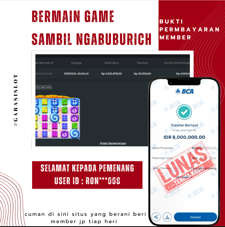 Selamat Kepada Id :ID RON***008 Atas Withdraw Rp. 8.000.000 Juta Hari ini. Ditunggu Withdraw Selanjutnya dan ajak juga teman temannya bergabung di GARASISLOT
