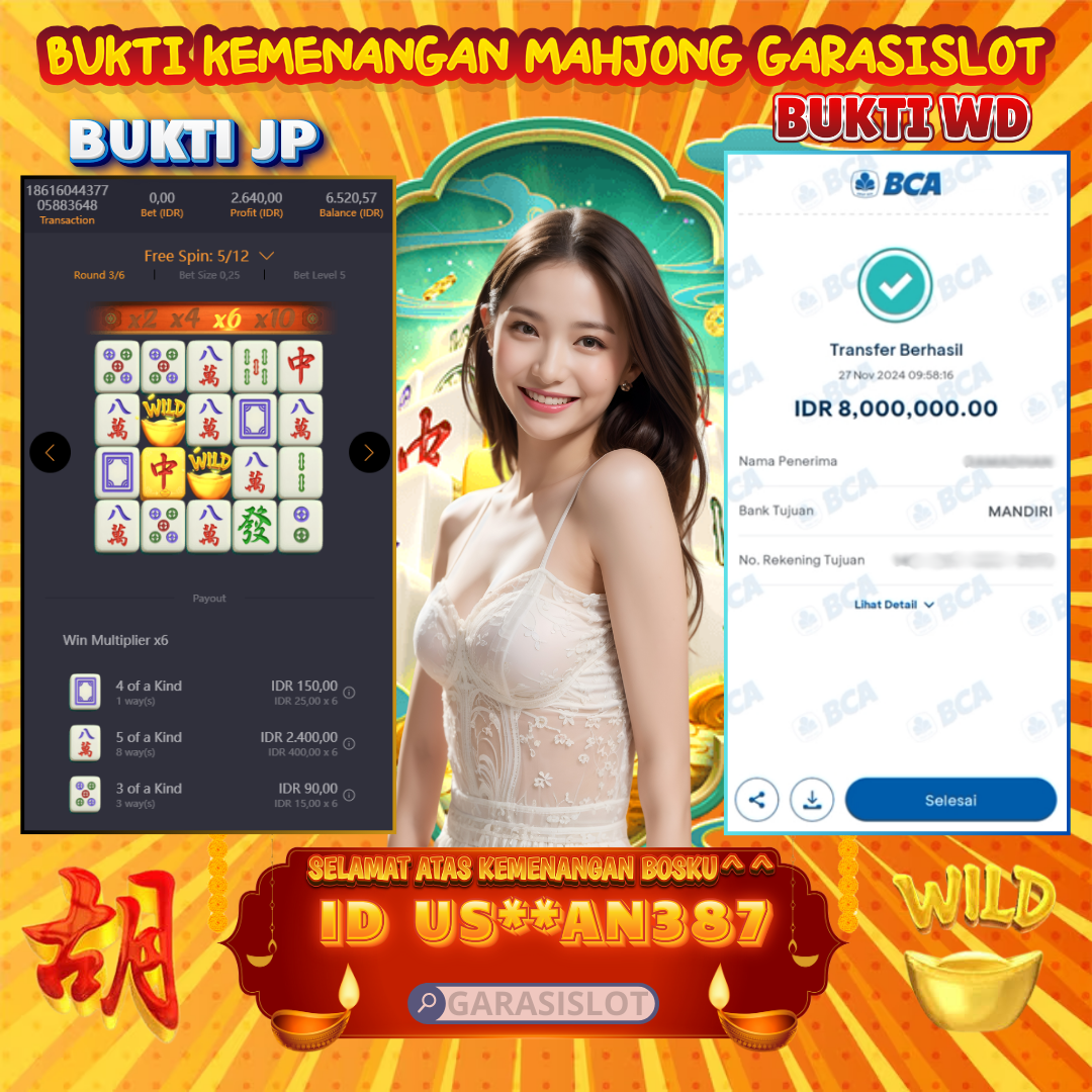 Selamat Kepada ID : US**AN387 Atas Withdraw Rp. 8.000.000 Juta Hari ini. Ditunggu Withdraw Selanjutnya dan ajak juga teman temannya bergabung diĀ GARASISLOT Bukti Kemenangan MAHJONG