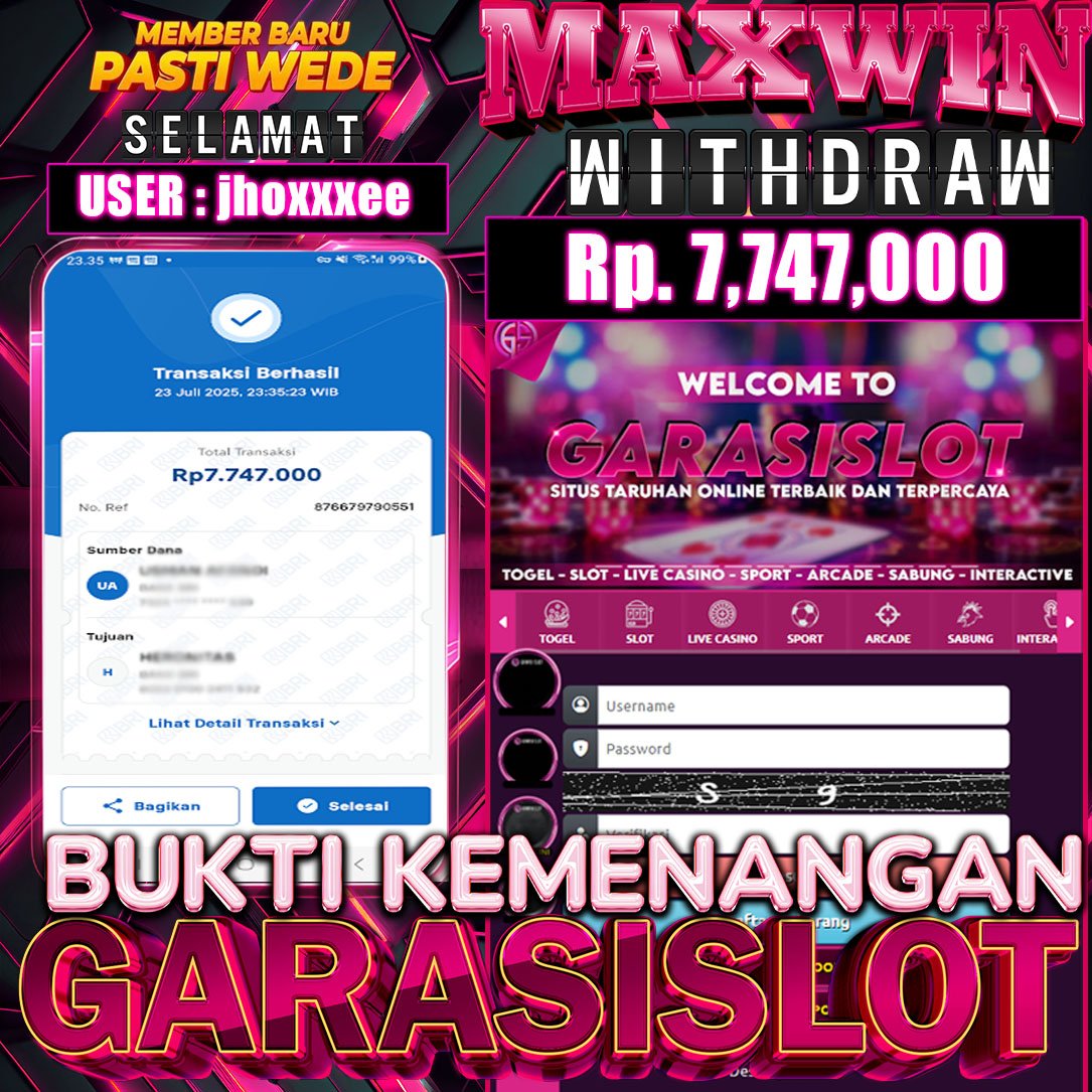 Selamat Kepada ID : jhoxxxee Atas Withdraw Rp 7.747.000 Juta Hari ini. Ditunggu Withdraw Selanjutnya dan ajak juga teman temannya bergabung di GARASISLOT Rumah ny seketer