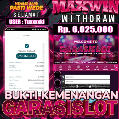 Selamat Kepada ID : tuxxxxki Atas Withdraw Rp 6.025.000 Juta Hari ini. Ditunggu Withdraw Selanjutnya dan ajak juga teman temannya bergabung di GARASISLOT Rumah ny seketer